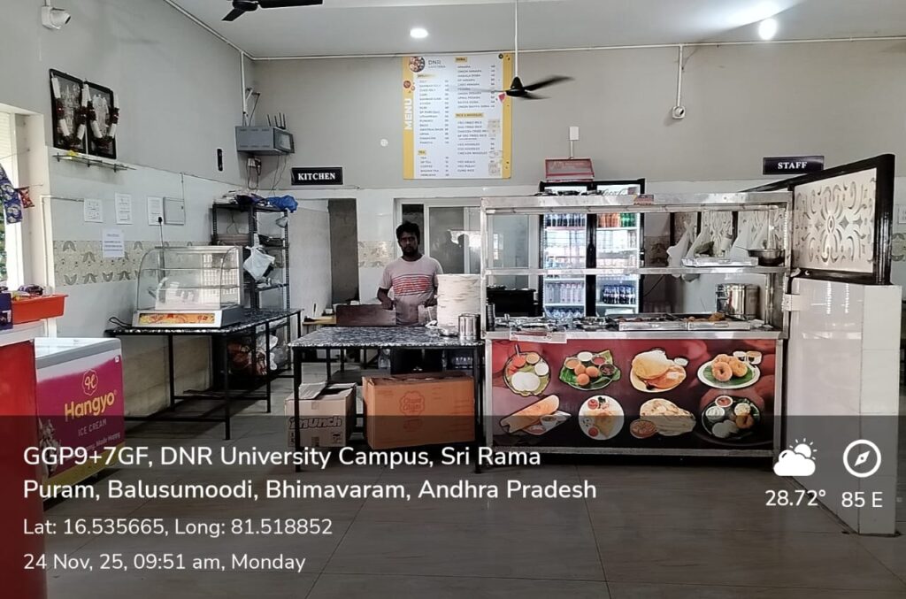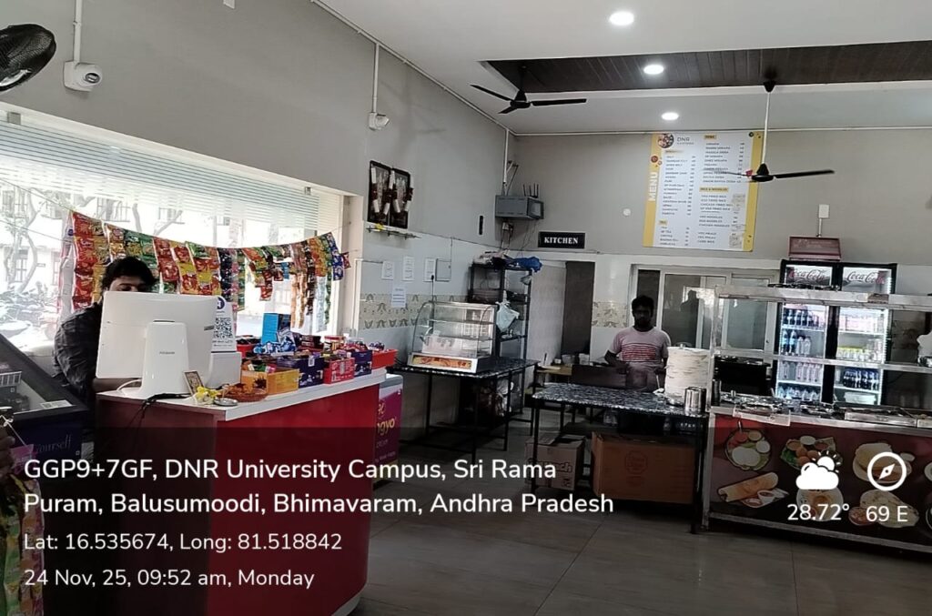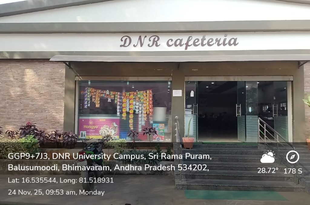 DNR College of Engineering and technology (A), Bhimavaram features a spacious and hygienic canteen with a seating capacity of nearly 200 students, offering a comfortable and well-organized dining experience. The cafeteria provides separate seating areas for girls, boys, and staff, ensuring convenience for all. With a clean and well-maintained dining hall, tables, ample ventilation, and bright lighting, the environment is ideal for students to relax and enjoy their meals. The canteen includes a modern billing counter, snack counters, and a neatly arranged food service area offering a variety of South Indian dishes such as idly, dosa, vada, puri, and other snacks. The kitchen and serving spaces are maintained with proper hygiene, while the welcoming exterior of the “DNR Cafeteria” and its organized layout make it a central and vibrant part of campus life.